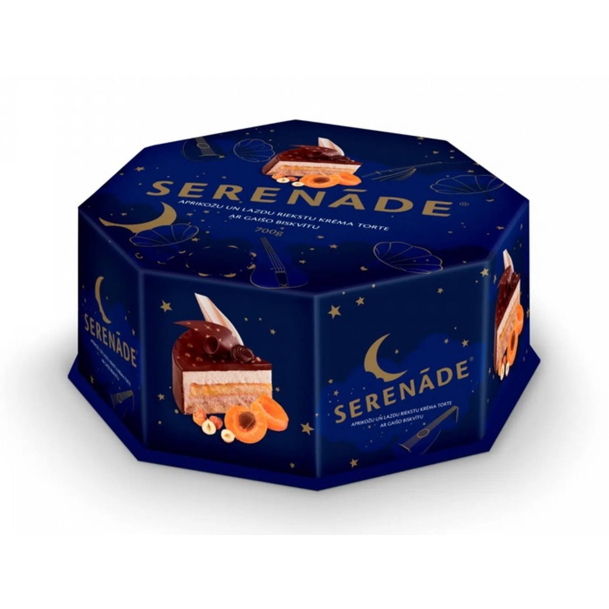 Klasiskās tortes Serenāde garšas iedvesma ir gūta paaudžu iecienītajās Laima konfektēs Serenāde. Šīs konfektes apvij romantisks stāsts – tās radīja kāds īpaši talantīgs saldumu meistars kā mīlestības apliecinājumu savai mīļotajai sievietei. Arī torte Serenāde katra dzīvē spēj uzburt īpašu mirkli. Gaišais biskvīts kārtās savijas ar saules piesātināto aprikožu pildījumu, un to kā punktiņš uz “i” papildina maigs riekstu krēms un šokolādes glazūra. Serenādes garša ir kā maģiska melodija ikvienam tās baudītājam.
