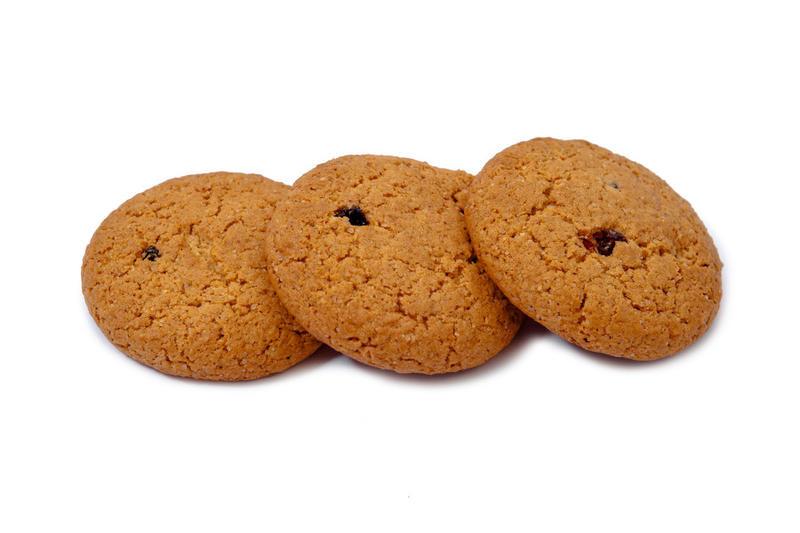 Apaļas formas cepumi ar auzu miltiem un rozinem, ar patikamu kanēļa un vanilina garšu, cietas structūras, krasa brūna (iepakots veikalá)